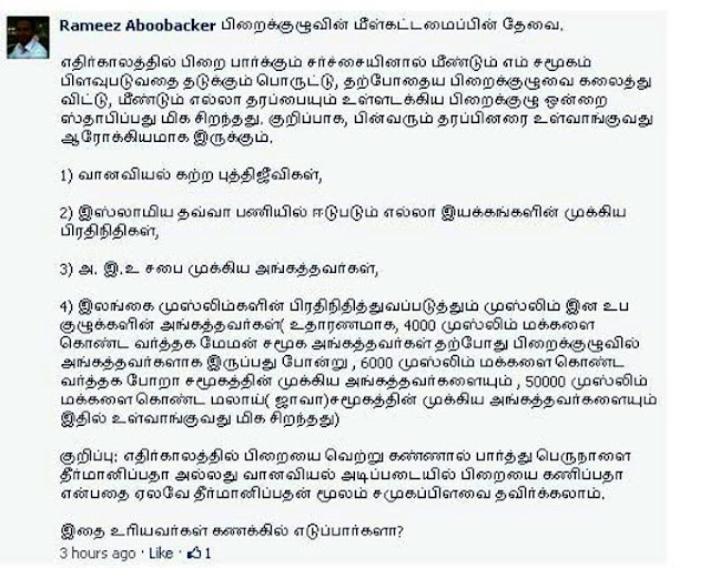 மிகக் குறைந்த சதவிகிதம் வாழும் செல்வம் மிக்க மேமன் சமூகத்துக்கு பிறைக்குழுவில் பெரியளவில் இடம் வழங்கப்பட்டிருக்கிறது. அதில் நமக்கு ஆட்சேபனையும் இல்லை. கிண்ணியாவுக்கு மேமன் சமூகத்திலிருந்து இருவர் சென்றிருப்பதையும் அவர்கள் அங்கிருந்து தமது குஜராத் மொழியிலேயே கொழும்புக்குக் கதைத்துள்ளதாகவும் கிண்ணியா ஜம்இய்யத்துல் உலமா அறிக்கை சொல்கிறது. கொழும்பிலும் ஒரு மேமன் சமூகத்தவரே அந்த அழைப்புக்குப் பதில் சொல்லியிருப்பதற்கு வாய்ப்புகள் அதிகம் உள்ளன.